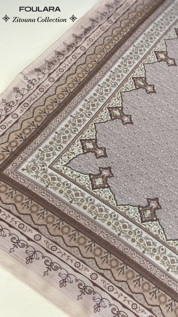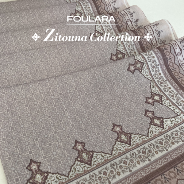 Discover the timeless beauty of the Zitouna Collection, where tradition meets modern refinement. Each scarf is made from a delicately textured fabric with a subtle reillure finish that offers a soft shine and helps the scarf stay in place — less slippery, more comfortable.