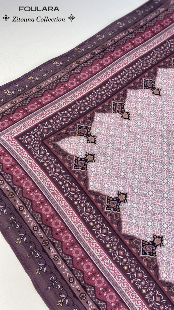 Discover the timeless beauty of the Zitouna Collection, where tradition meets modern refinement. Each scarf is made from a delicately textured fabric with a subtle reillure finish that offers a soft shine and helps the scarf stay in place — less slippery, more comfortable.